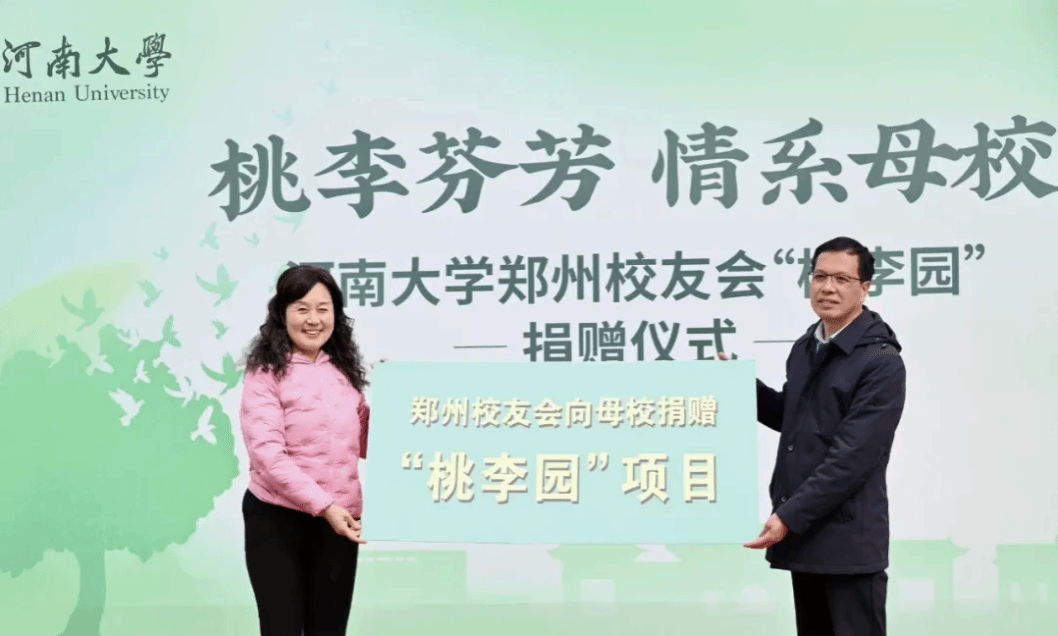 3月19日,河南大学郑州校友会“桃李园”捐赠仪式在龙子湖校区举行。郑州校友会会长张占仓、执行会长兼秘书长李传荣、副会长郭建伟,河南大学龙子湖校区综合管理办公室主任刘香宇、校友工作办公室副主任骆春丽及校友代表齐聚现场,共叙校友情谊,共为母校添绿,捐赠仪式由教育发展基金会副主任高欢主持。